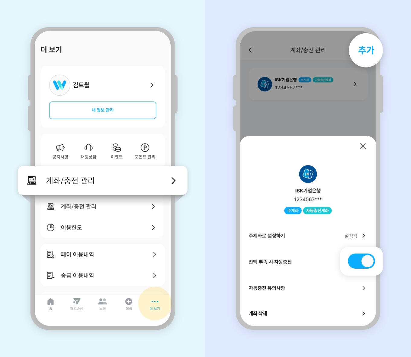 트래블월렛 앱 → 우측 하단 ‘더보기’ → 계좌/충전 관리 → 계좌 선택 → 잔액 부족 시 자동충전