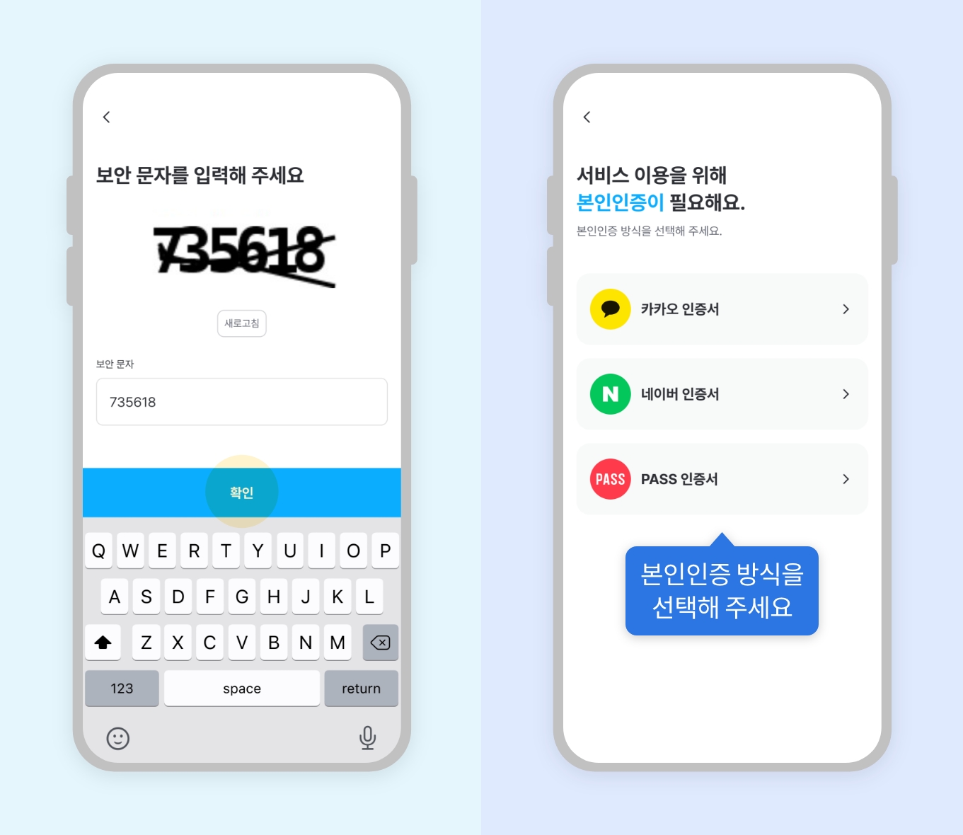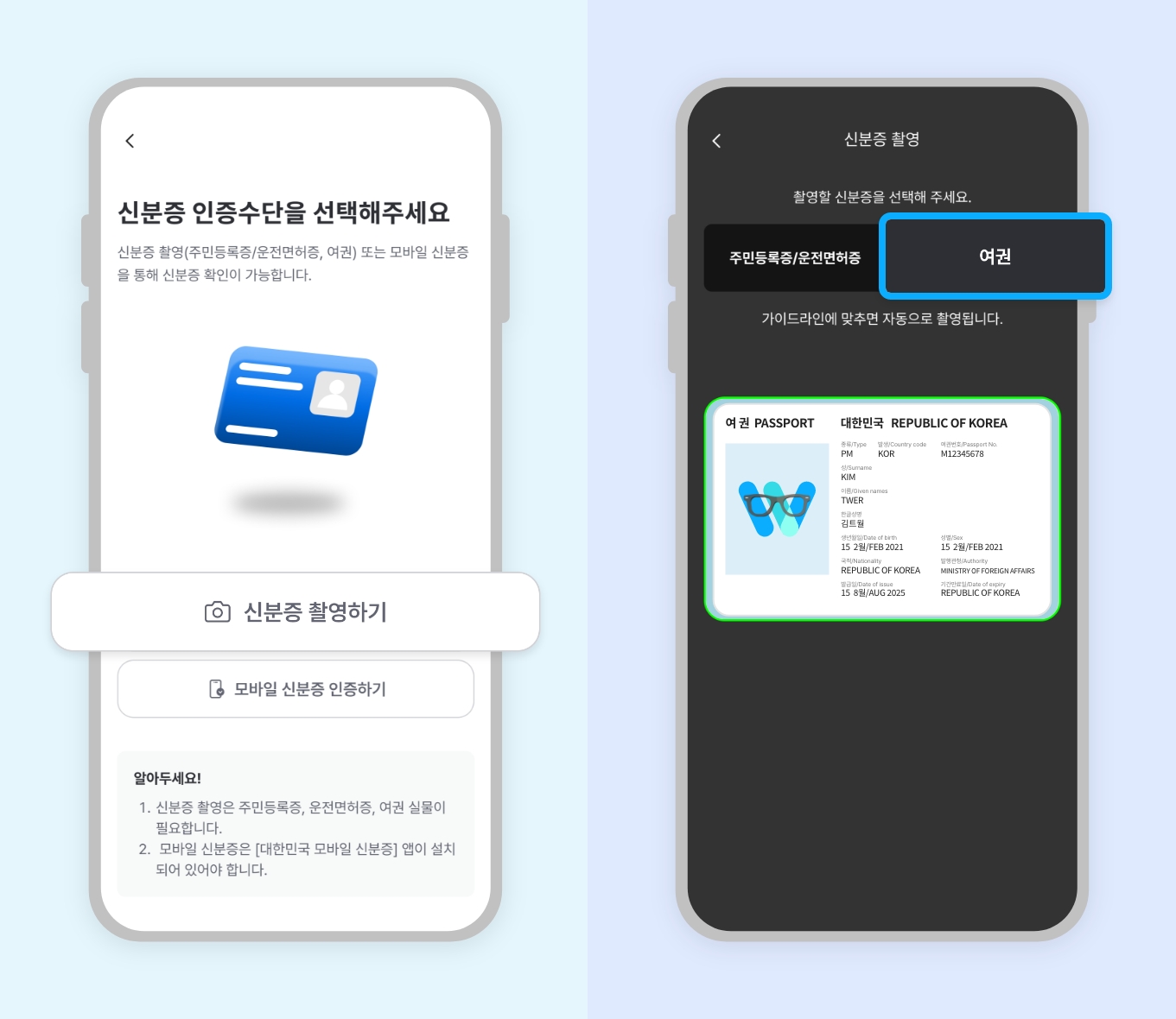 1. 신분증 촬영2. 신분증 정보 확인 및 추가 정보 입력3. 보안문자 입력 후 본인인증 수단 선택4. 본인인증 완료또 다른 사항이 궁금하다면?본인인증 및 고객확인 시 임시신분증, 청소년증도 제출 가능한가요?FAQ 목록으로 돌아가기