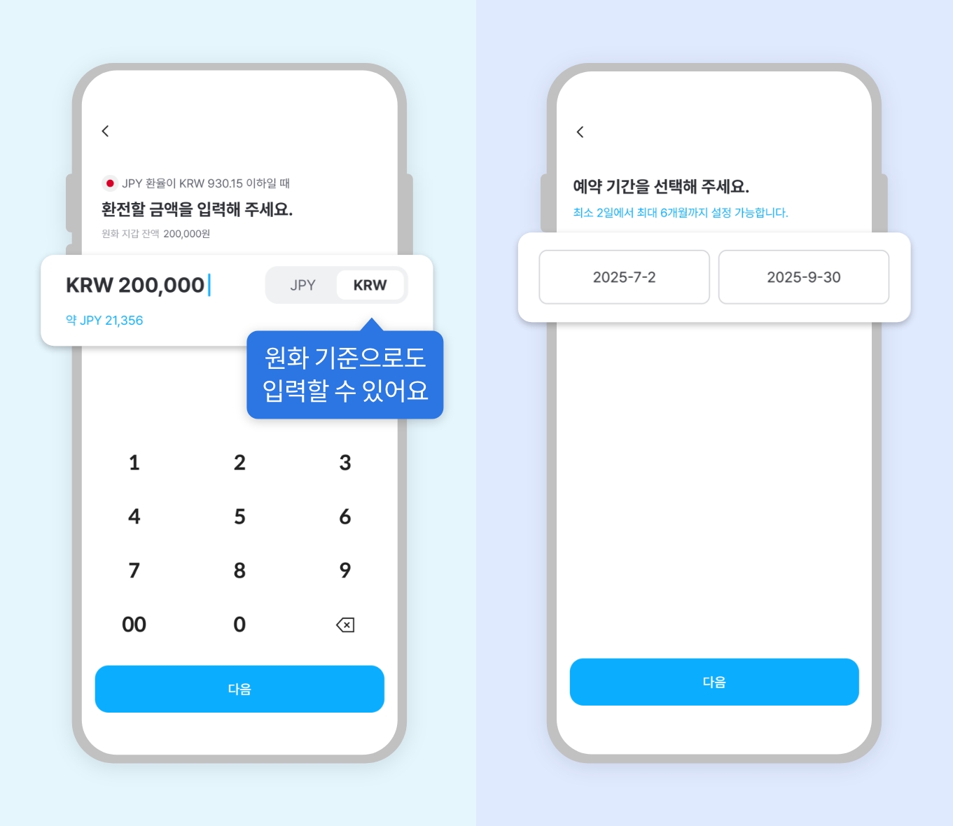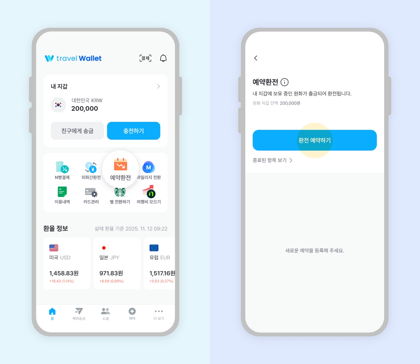 1. 트래블월렛 앱에서 '예약환전' 선택2. 환전할 '통화' 선택 후 '희망 환율' 입력3. 환전할 '금액' 입력 후 '예약 기간' 선택4. 환전 예약 완료또 다른 사항이 궁금하다면?‘예약환전’은 최대 몇 개까지 신청할 수 있나요?‘예약환전’ 신청 전 원화를 충전해야 하나요?FAQ 목록으로 돌아가기