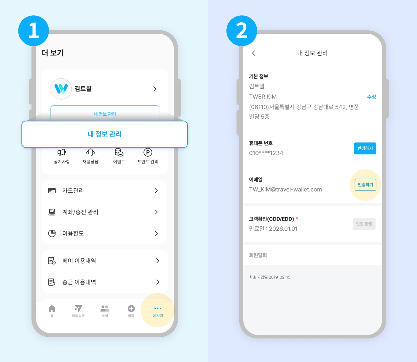 트래블월렛 앱 → 우측 하단 ‘더보기’ → 내 정보 관리 → 이메일 인증