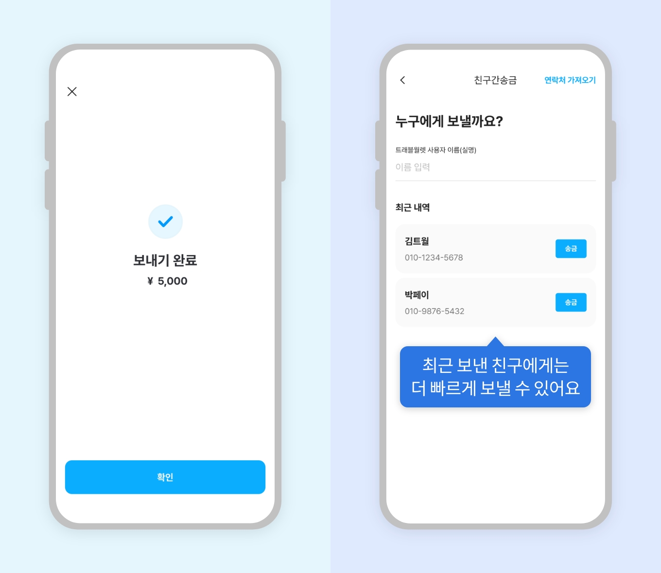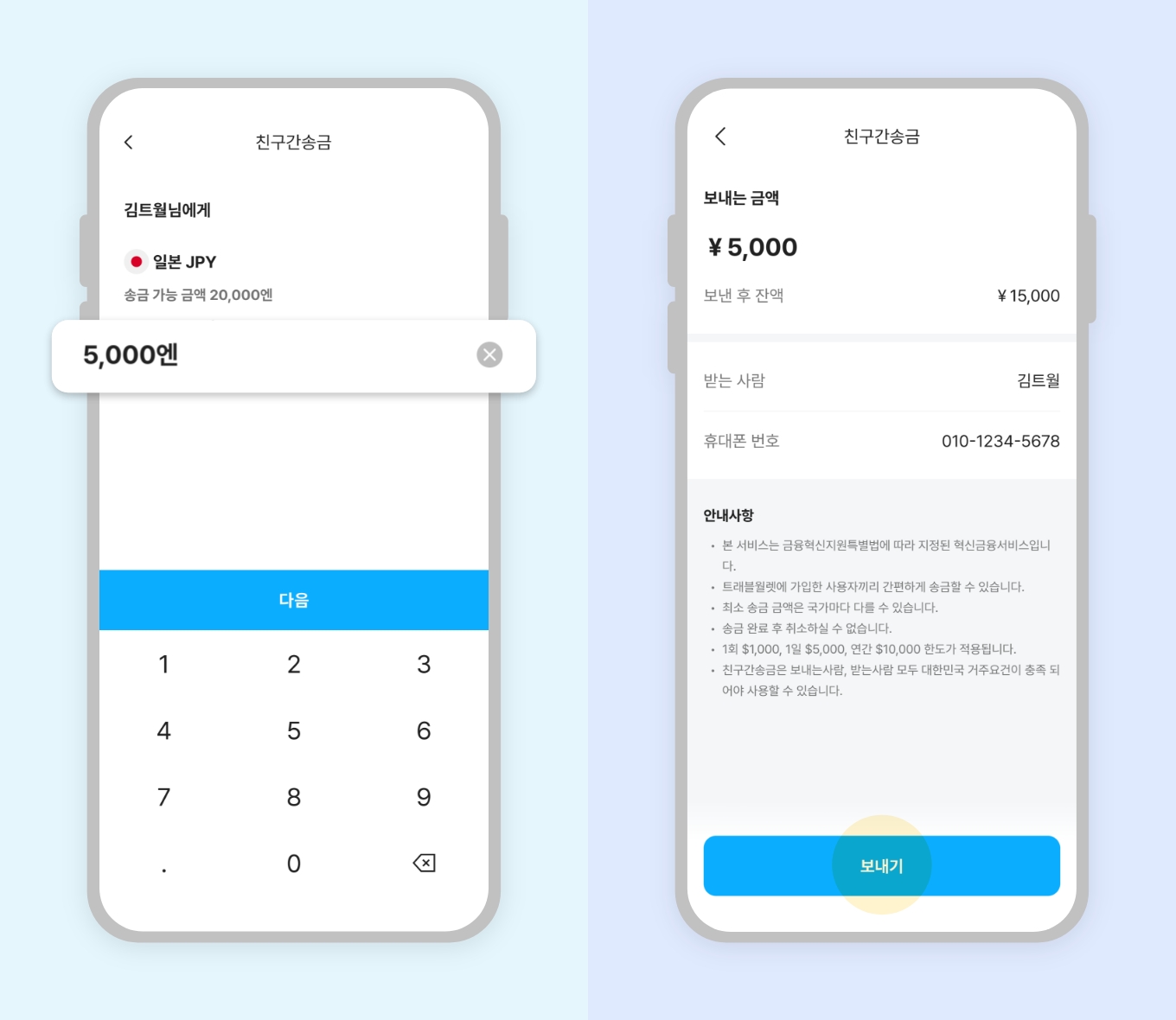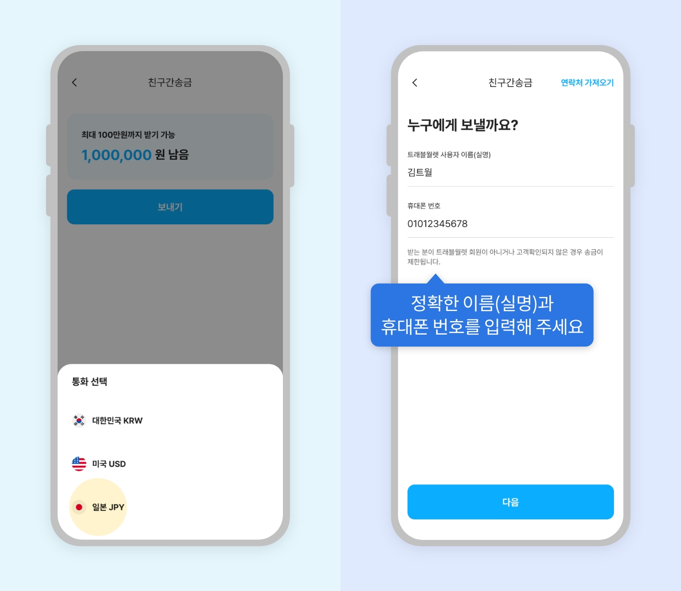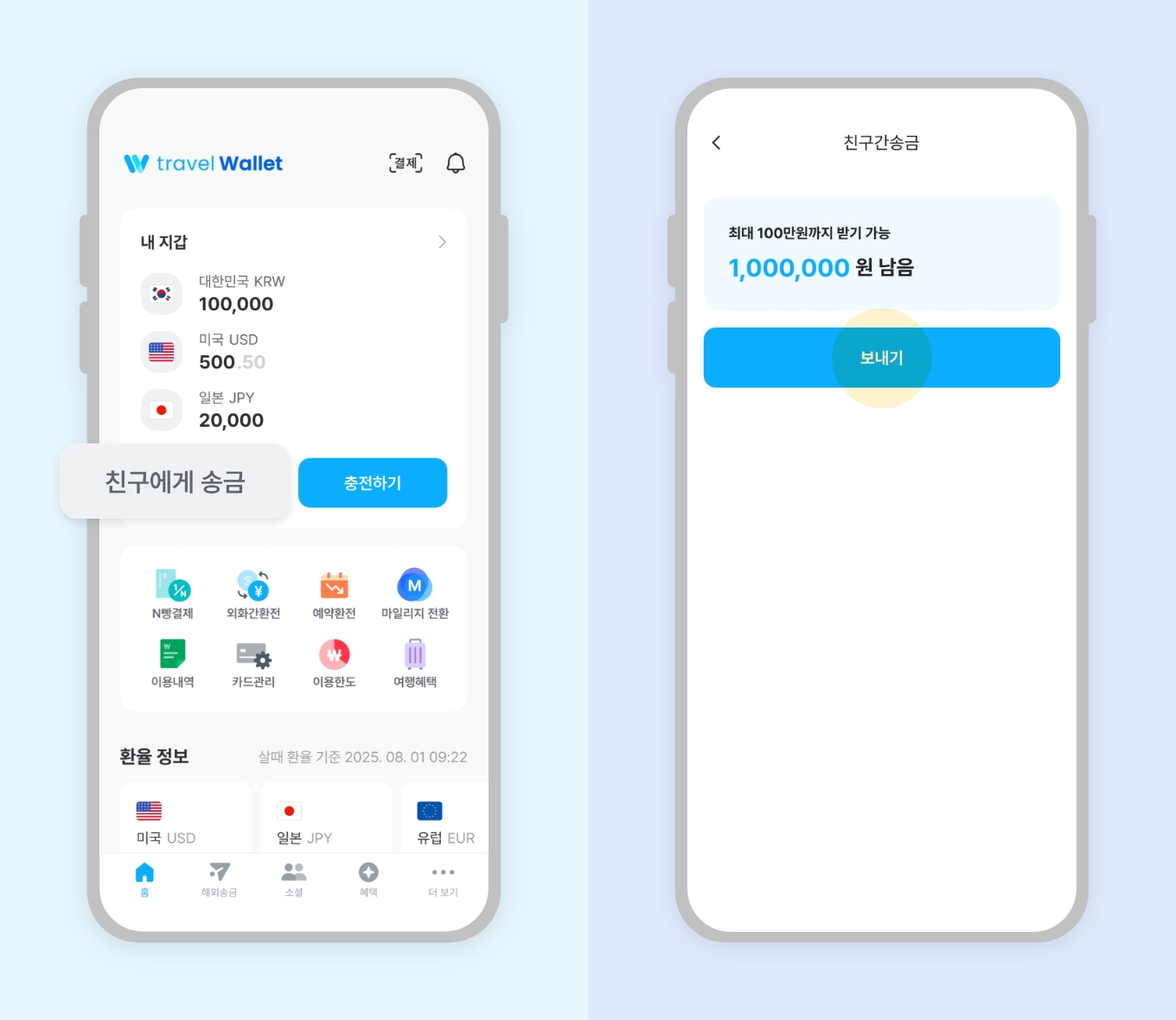 1. 트래블월렛 앱에서 ‘친구에게 송금’ 선택2. 송금할 ‘통화’ 선택 후 상대방 정보 입력3. 송금할 금액 입력 후 보내기4. 친구에게 송금 완료또 다른 사항이 궁금하다면?‘예약환전’은 최대 몇 개까지 신청할 수 있나요?‘예약환전’ 신청 전 원화를 충전해야 하나요?FAQ 목록으로 돌아가기