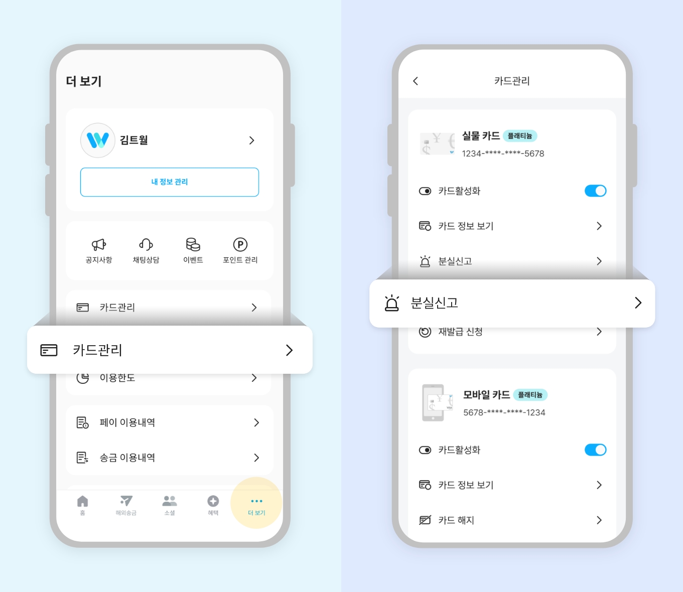 트래블월렛 앱 → 우측 하단 ‘더보기’ → 카드관리 → 분실신고
