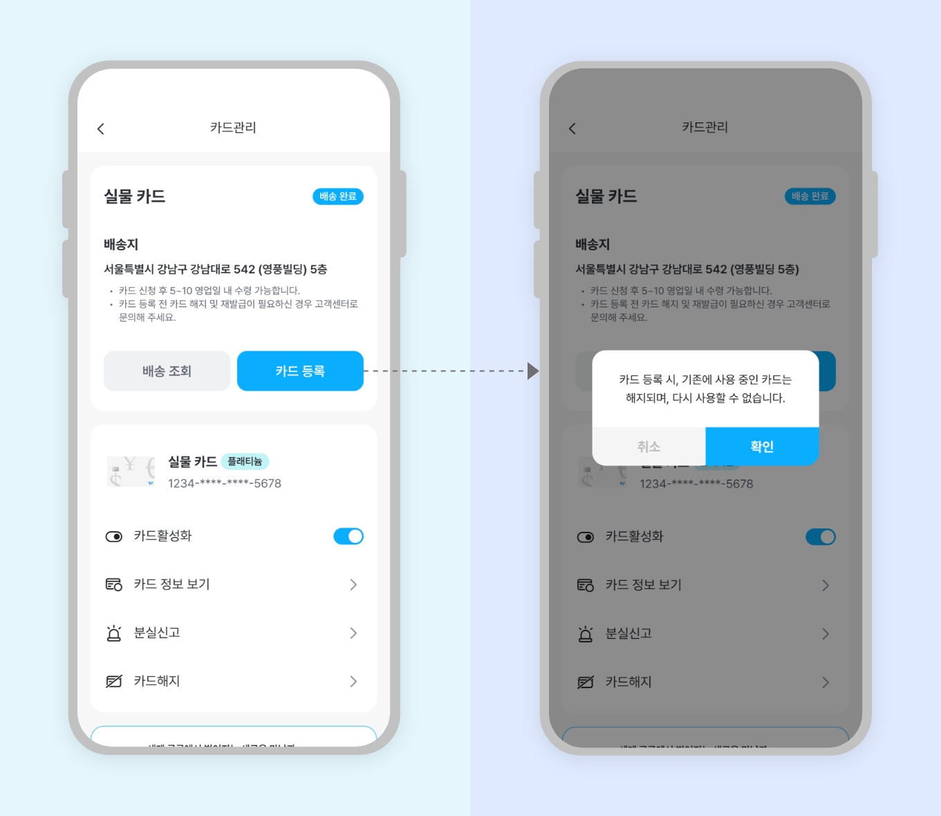 단, 신규 실물 카드를 등록하는 즉시 기존 실물 카드는 자동 해지되어 복원 및 이용이 불가합니다.