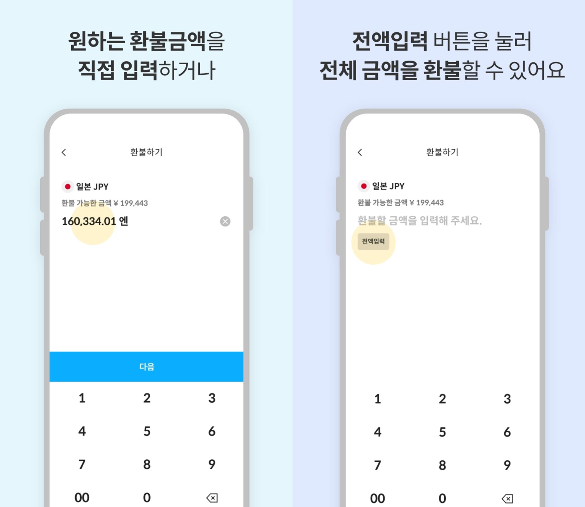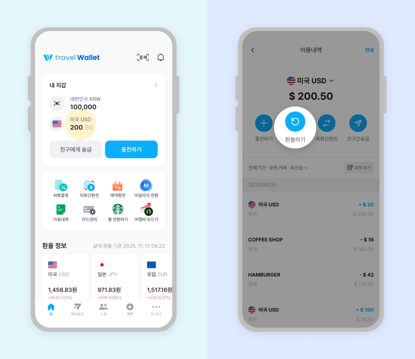 트래블월렛 앱 → ‘내 지갑’ 에서 환불 할 통화 선택 → 환불하기