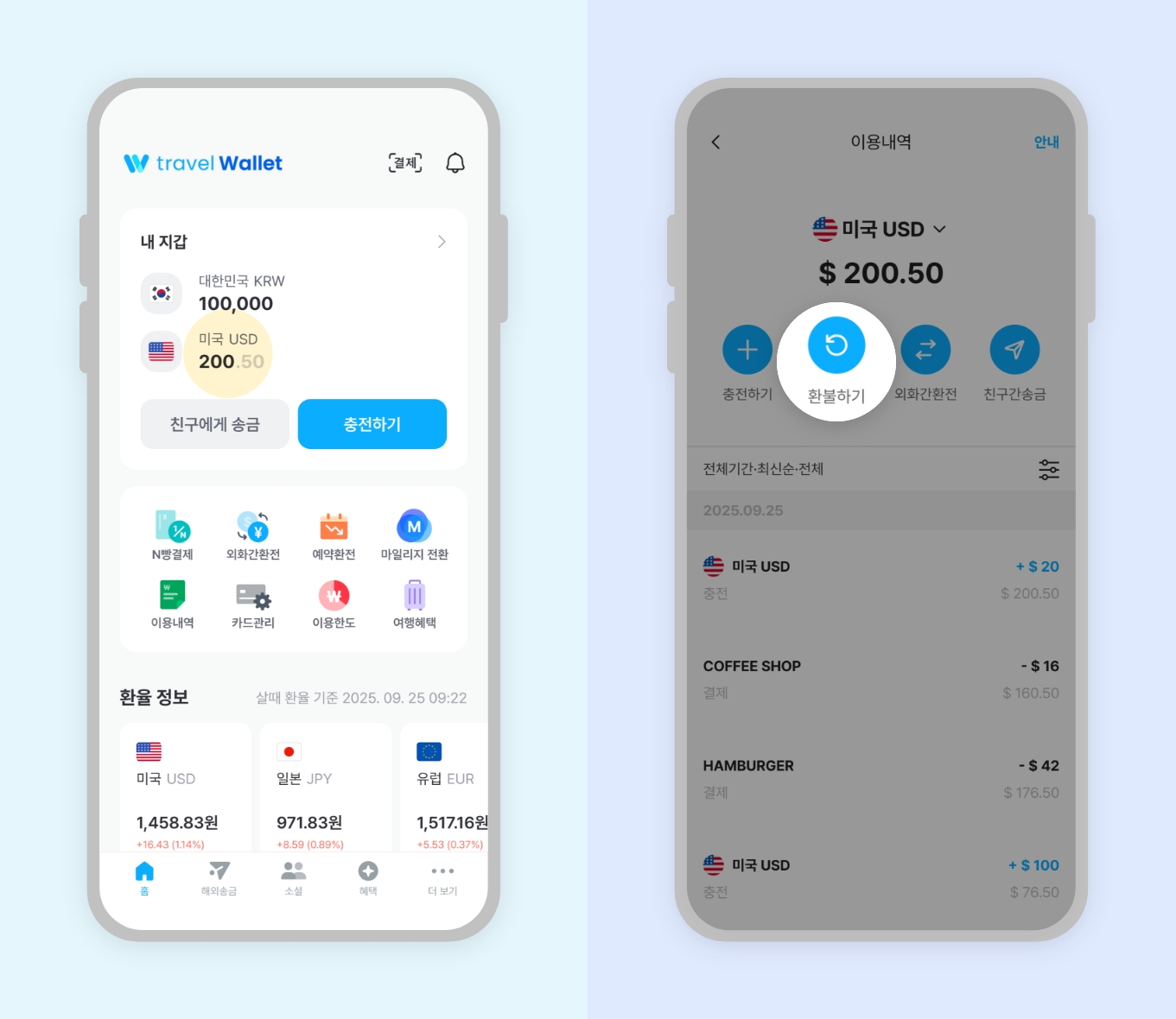 트래블월렛 앱 → ‘내 지갑’ 에서 환불 할 통화 선택 → 환불하기