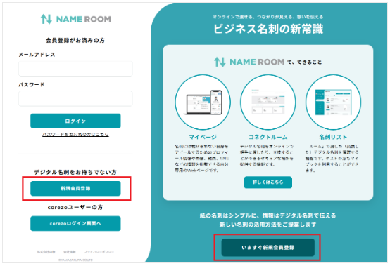 デジタル名刺サービス「NAMEROOM bio」のログイン画面から「新規会員登録」ボタンをクリックし、メールアドレスを入力して送信します。