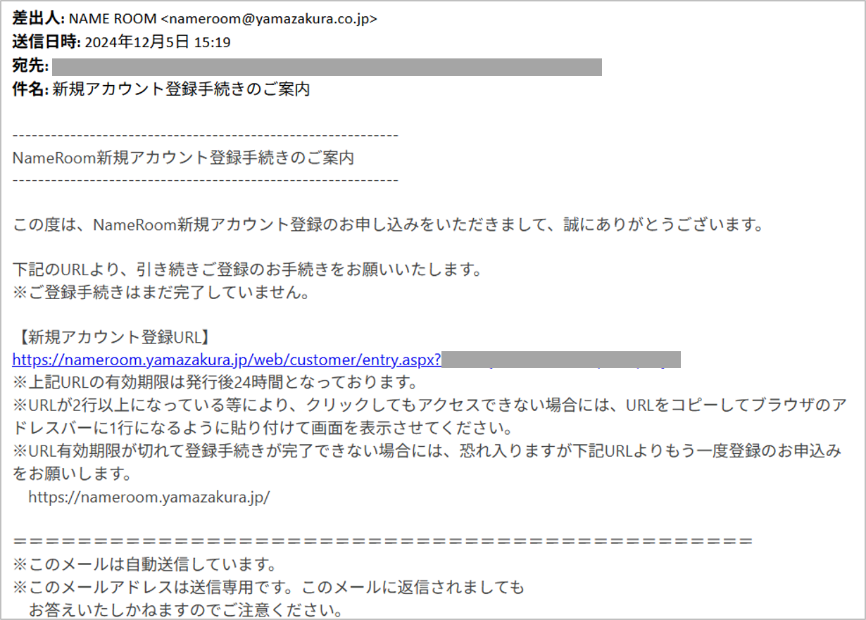 ご登録いただいたメールアドレスに「新規会員登録手続きのご案内」が届きますので、メール内の【新規アカウント登録URL】をクリックします。