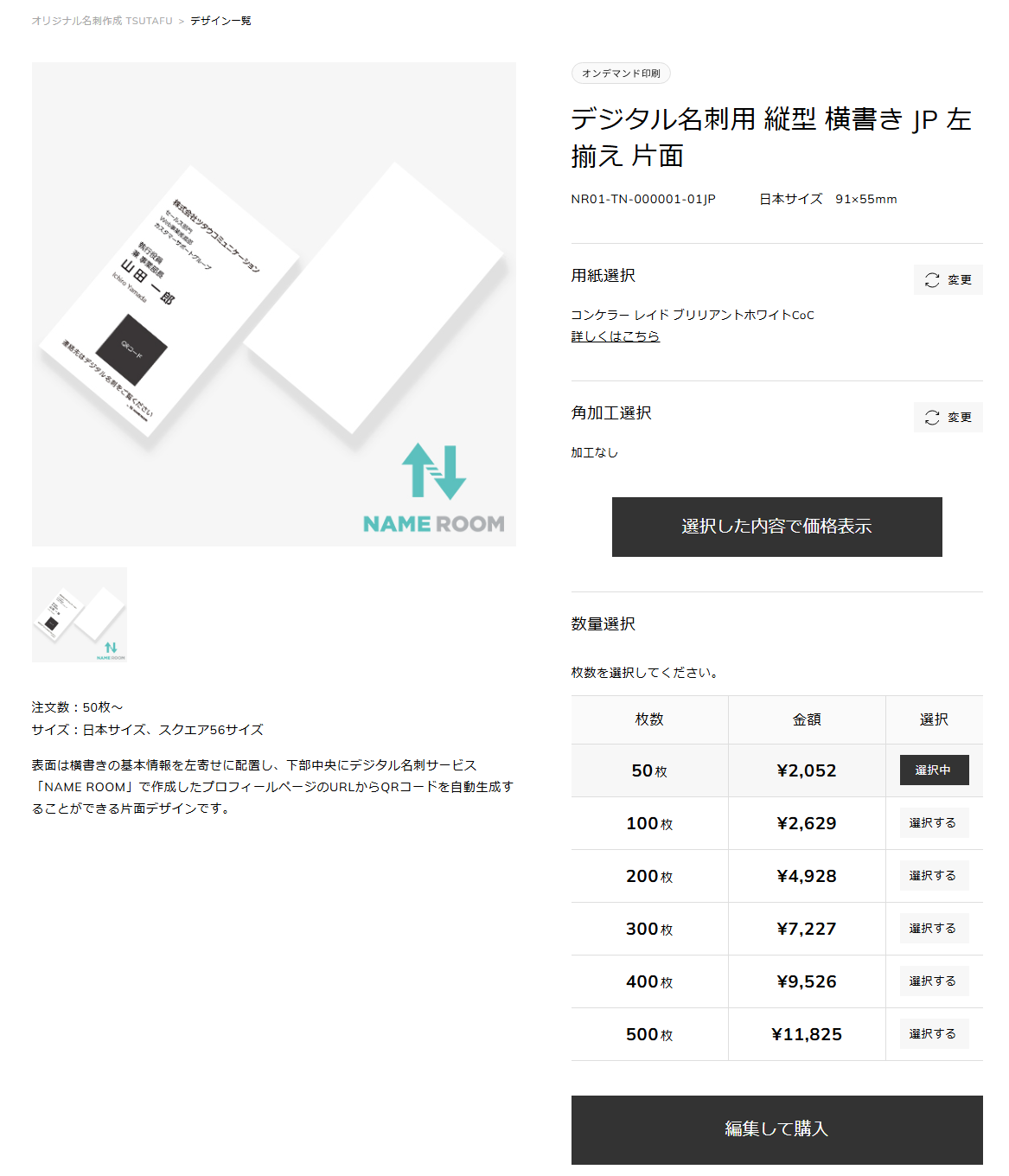 デザイン詳細画面から、用紙と加工オプションを選択し、発注枚数を選択したら「編集して購入」ボタンをクリックします。
