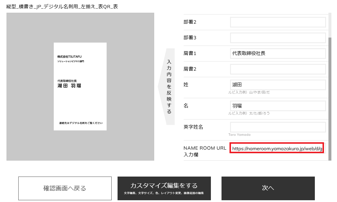 左側のプレビュー画面に入力した内容を反映させる場合は、真ん中の「入力内容を反映する」を押してください。