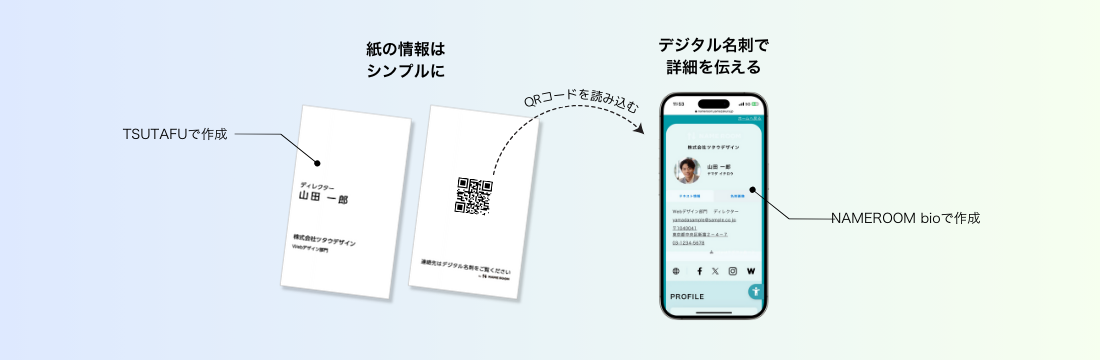 全体の流れとしては「NAMEROOM bio」でプロフィールページを作成したあとに、「TSUTAFU」(当サイト)で紙の名刺を作成します。