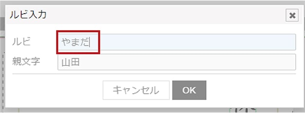 ルビ入力画面から、選択した文字に対するルビ(フリガナ)を入力し、OKを押します。