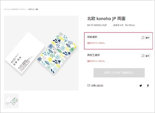 名刺作成の際に、用紙選択は必須になりますので、用紙の選択を完了しないと先へは進めません。