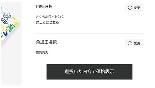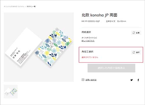 名刺の角を角丸や角落とし加工をしたい場合は、デザイン詳細画面の角加工選択から選択できます。