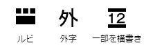 ①ルビ…ルビ(フリガナ)を入力したいときに使用します。 ②外字…外字を入力したいときに使用します。 ③一部を横書き…縦書きアイテム内の文字を横書きにしたいときに使用します。