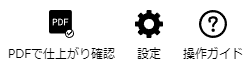 ①PDFで仕上がり確認…仕上がり確認用のPDFがダウンロードできます。 ②設定…表示単位やグリッドの設定を行います。 ③操作ガイド…ヘルプページにリンクします。