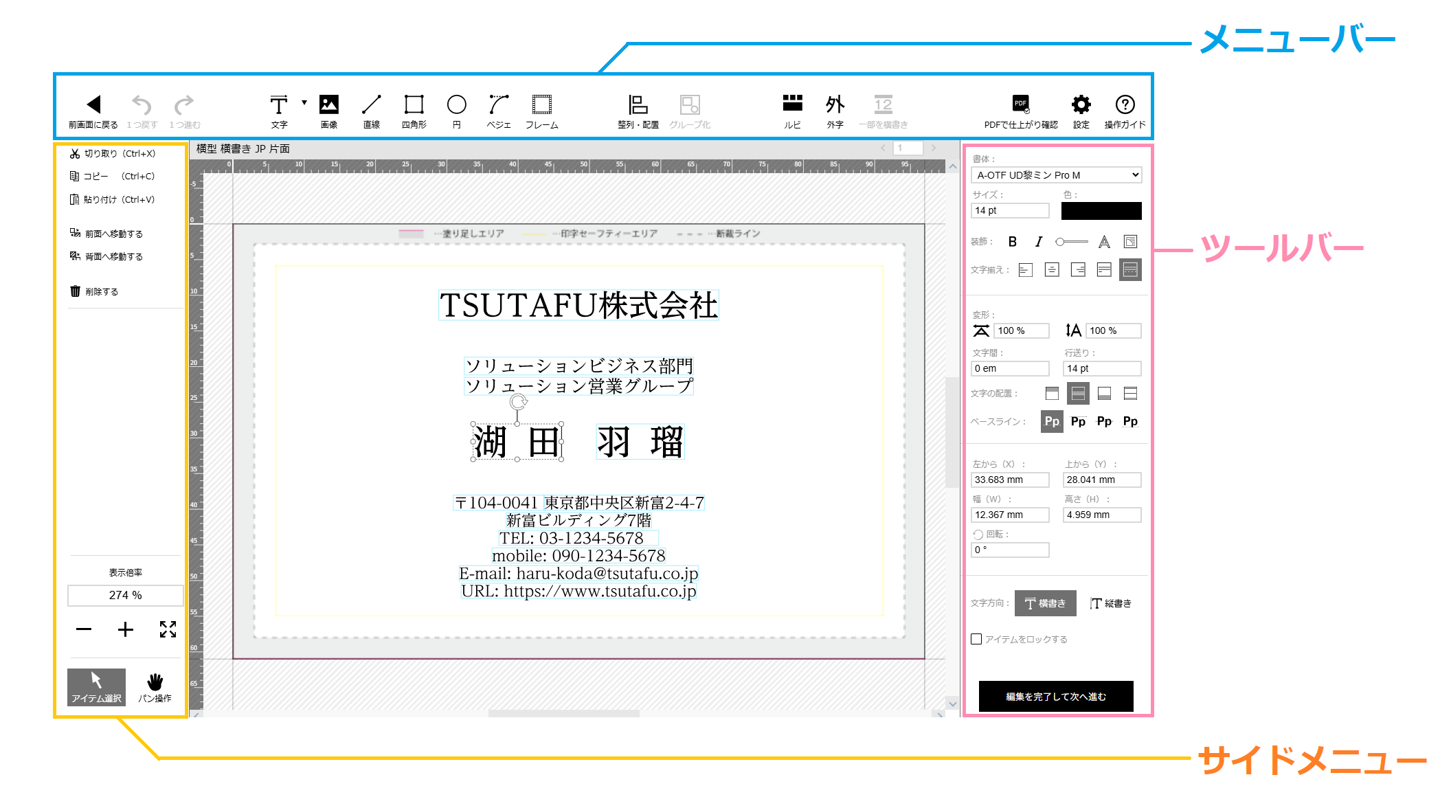 ①切り取り…選択したアイテムを切り取ります。(ショートカットキー…Ctrl+X) ②コピー…選択したアイテムをコピーします。(ショートカットキー…Ctrl+C) ③貼り付け…選択したアイテムを貼り付けます。(ショートカットキー…Ctrl+V) ④前面へ移動する…選択したアイテムを最前面へ移動します。 ⑤背面へ移動する…選択したアイテムを最背面へ移動します。 ⑥削除する…選択したアイテムを削除します。