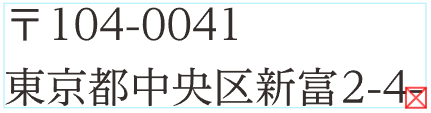 入力した文字が文字枠内から消えてしまった場合は、文字と文字枠のサイズが合っていない可能性があります。(下図のように右下に赤い✖印が表示されます。)この場合、文字枠を縦横に広げて調整します。