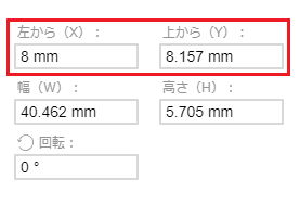 キャンバスの左上を基点(X:0mm、Y:0mm)として、文字枠の左上の位置を数値で表しています。Xの数値変更で横移動、Yの数値変更で縦移動します。
