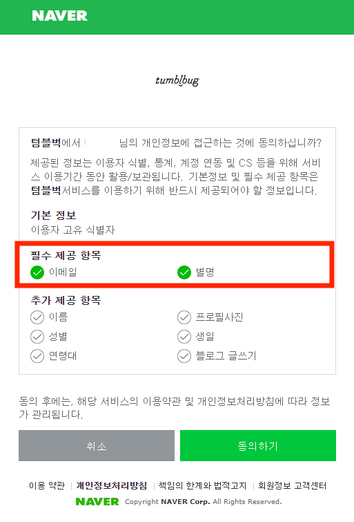 텀블벅 계정 가입에 이용하실 네이버 계정으로 네이버에 로그인하신 후에, 아래와 같이 조치를 부탁드리겠습니다.