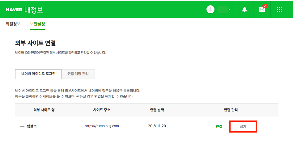 리스트 가운데 텀블벅은 아래와 같이 표시되고 있을텐데요. 아래 스크린샷 우측의 '끊기'를 누르고 다시 텀블벅에서 네이버 연동 가입을 시도해주시면 됩니다.