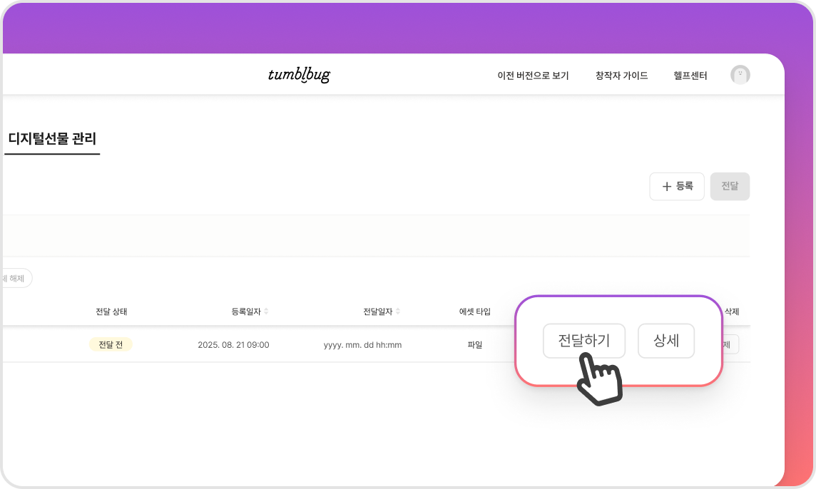 여러 개의 파일을 동일한 대상에 한 번에 전달하실 때에는 디지털 선물 관리 페이지에서 전달할 파일을 선택하신 후, 우측 상단 [+등록]버튼 우측의 [전달] 버튼을 선택해 주세요.
