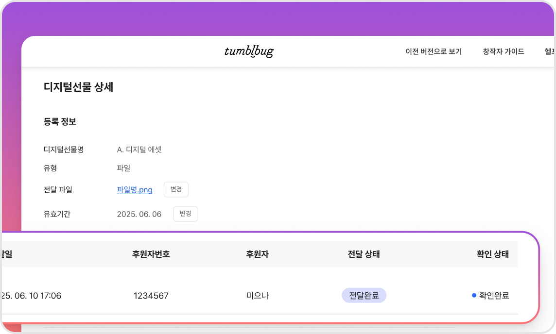 디지털 선물 전달 상태가 ‘전달 중’이거나 ‘전달 완료’인 경우, [변경] 버튼을 통해 텍스트 또는 파일 및 유효기간을 수정할 수 있습니다. 파일 또는 텍스트 변경 시 후원자에게 알림톡이 발송됩니다.