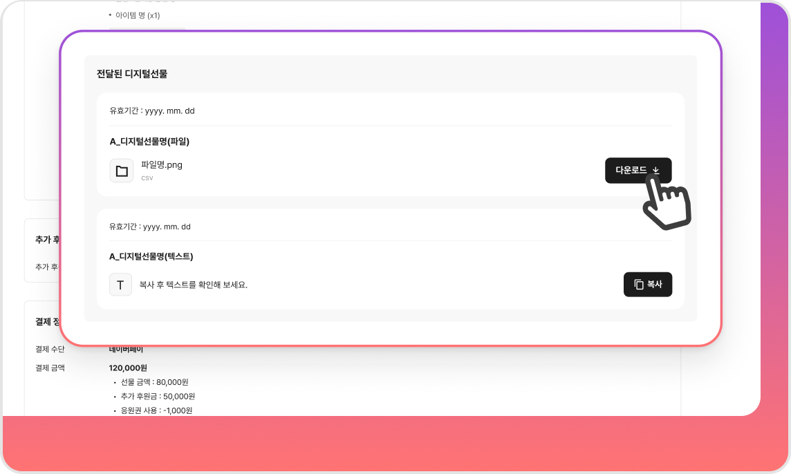 선물이 전달되면 후원자 계정에 등록된 연락처로 알림톡이 발송됩니다. 후원자는 후원한 프로젝트(내 후원)>후원 상세 페이지에서 선물을 다운로드 또는 복사할 수 있습니다. 회수되었거나 유효기간이 만료된 디지털 선물은 다운로드 또는 복사 버튼이 비활성화 됩니다.