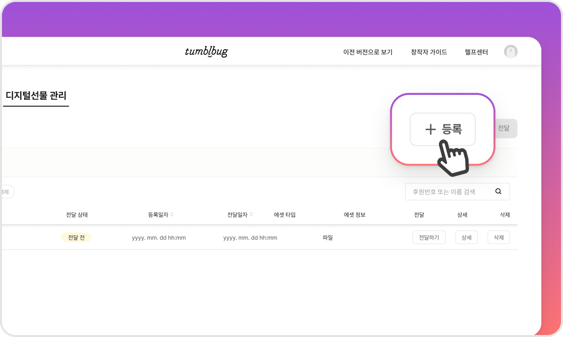 4. [등록하기] 버튼을 선택하시면 디지털 선물 관리 목록에 등록된 디지털 선물을 확인하실 수 있습니다.