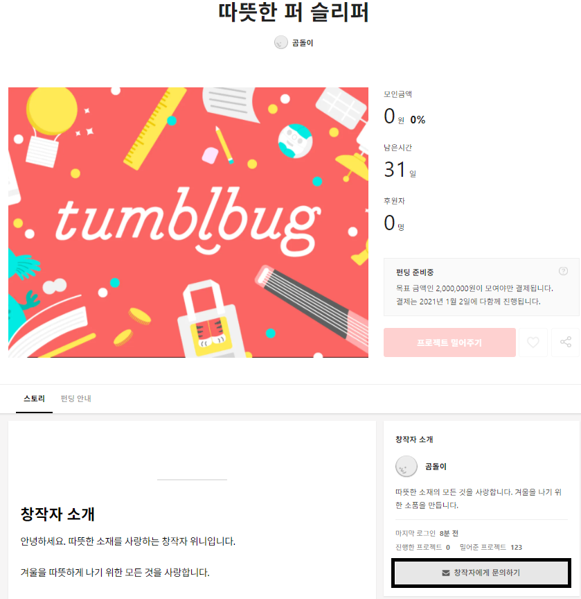 이 경우 프로젝트의 페이지 우측 [창작자에게 문의하기] 버튼을 통해 창작자에게 수령한 선물에 대한 문제를 알려주시기 바랍니다.