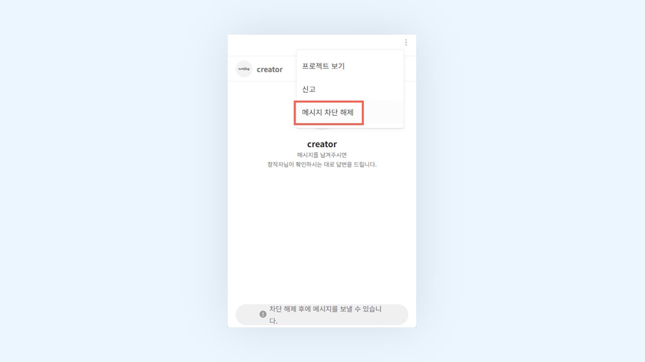 메세지를 차단한 프로젝트의 [창작자 문의] > 더보기(…)> 메시지 차단 해제를 선택해 주세요.