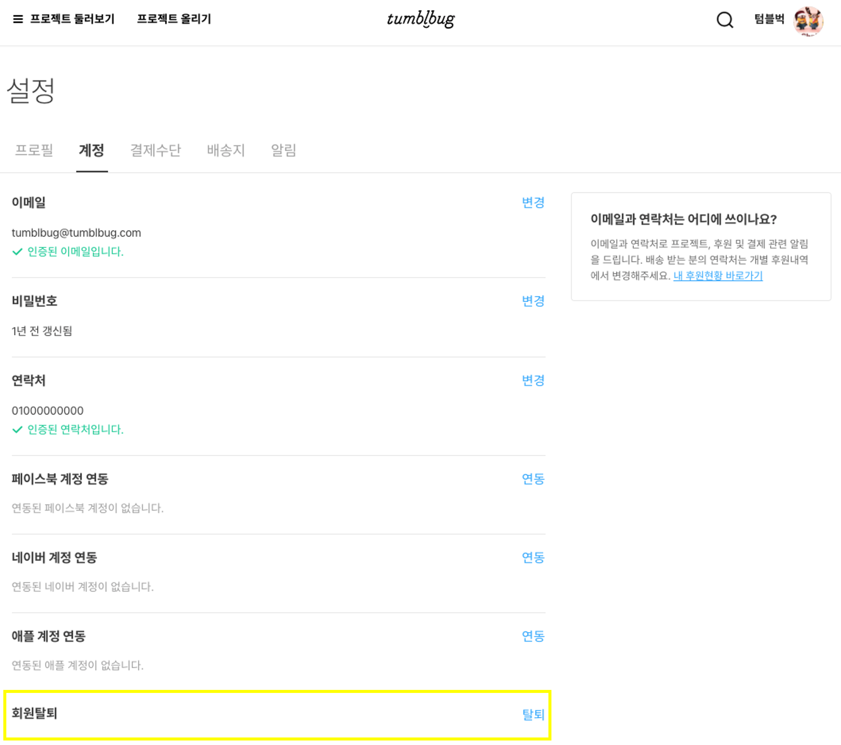 * 가입하신 메일 계정에 접속이 어려우신 경우, 설정 > 계정에서 사용하시는 메일 주소로 변경하신 다음 탈퇴 요청을 해주시기 바랍니다.