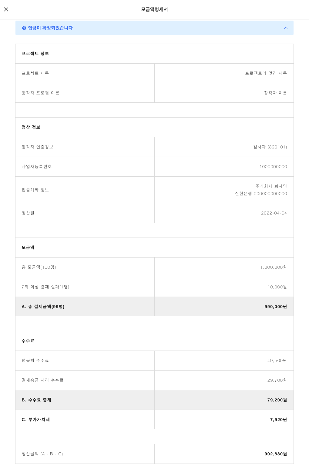 프로젝 마감일 다음 날 결제가 시작되면 프로젝트 페이지 우측 "프로젝트 관리 > 모금액 명세" 메뉴에서 모금액 명세서를 확인하실 수 있습니다.