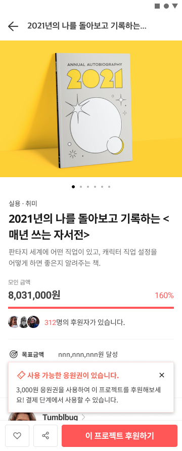 * 프로젝트 응원권 적용 후 후원금액이 1,000원 이상인 경우에만 응원권을 사용할 수 있습니다.