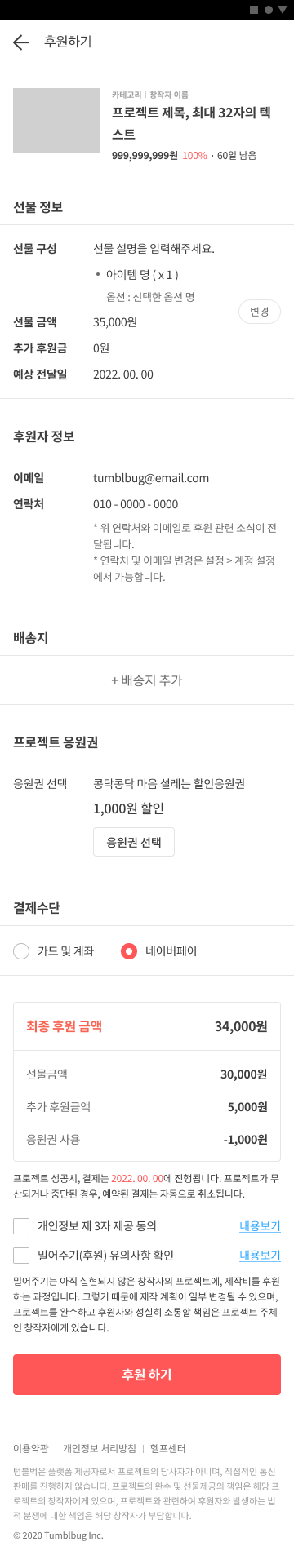 선택하신 선물의 최소 후원 금액과 추가 후원 금액에서 응원권 사용 금액을 차감한 금액이 최종 후원 금액이 되며, 프로젝트 성공하면 최종 후원 금액이 예약하신 결제 수단으로 결제됩니다.