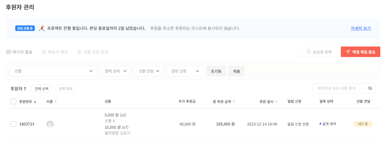 추가한 선물 구성을 선택한 후원자들의 명단을 후원자 명단 엑셀 파일에서 확인하실 수 있기 때문에 제작, 발송 시 관리가 용이합니다.