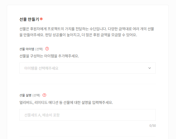 *이미 만들어두신 선물 구성 중, 후원자가 선택한 선물은 수정이 불가합니다. 새로운 선물 구성 추가만 가능해요.