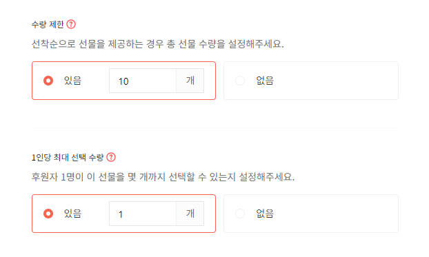 [프로젝트 관리 - 선물 구성 - 선물 만들기 - 1인당 최대 선택 수량] 메뉴에서 선물을 1명이 후원할 수 있는 최대 수량을 설정할 수 있습니다.