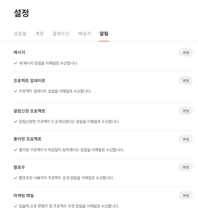 메시지, 프로젝트 업데이트, 뉴스레터 등에 대한 알림 수신 여부를 변경할 수 있습니다.