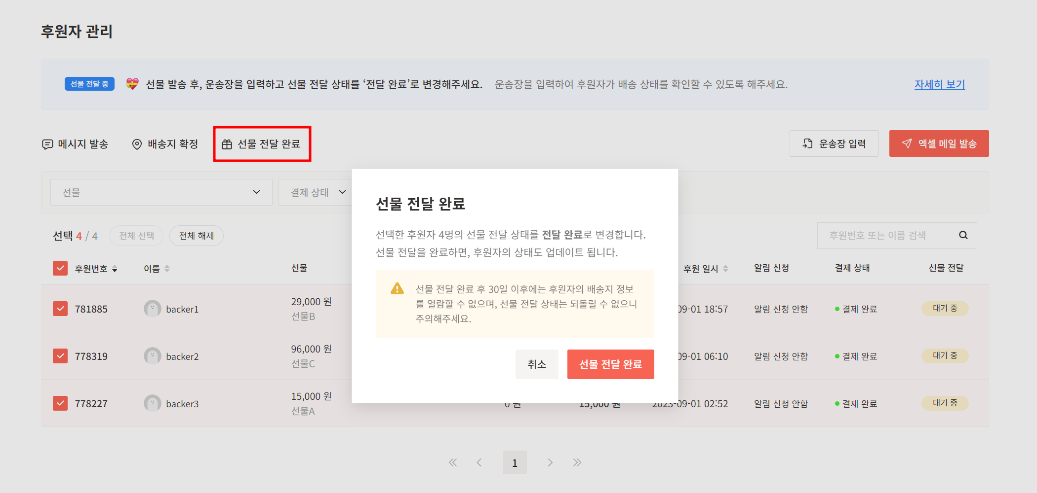 후원자 관리에서 선물 전달을 완료한 후원자를 선택 후, 선물 전달 완료 버튼을 눌러주세요.