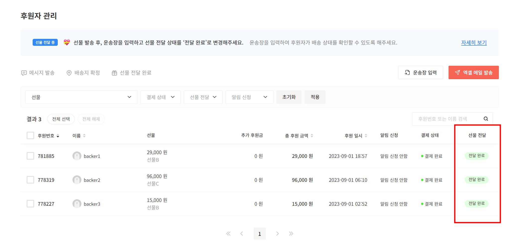 선물 전달 상태가 '대기 중'에서 '전달 완료'로 변경되고, 후원자의 후원현황에는 선물 전달 완료일이 표시됩니다.