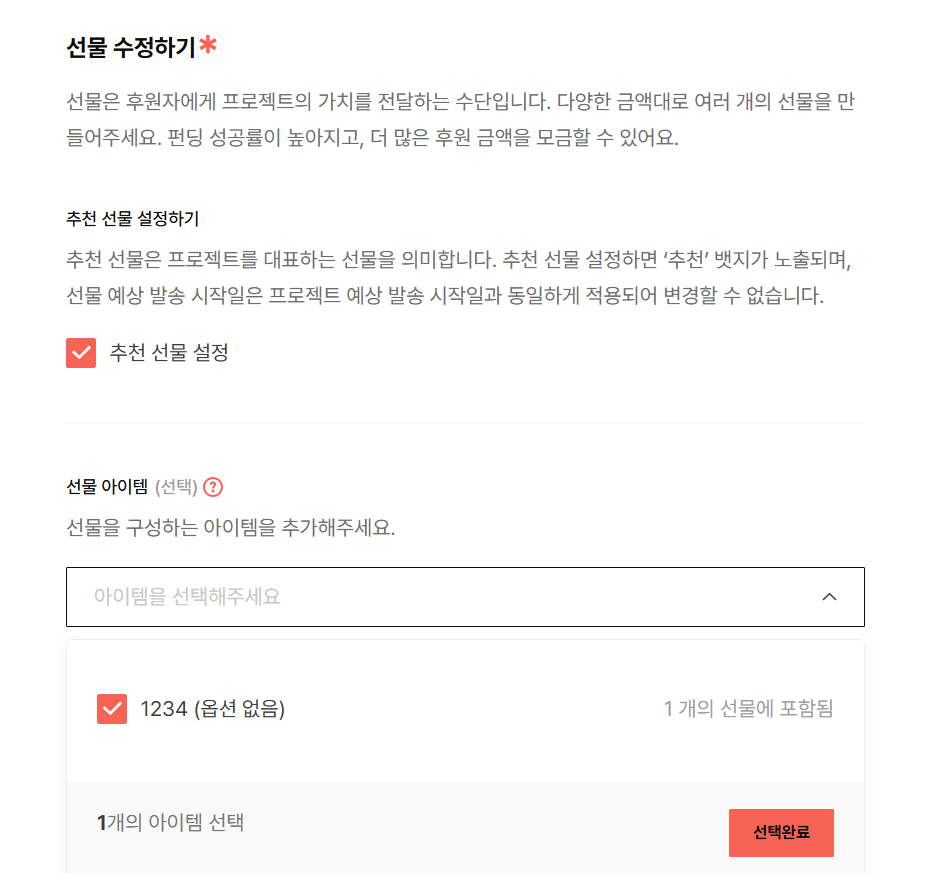 프로젝트를 대표할 '추천 선물'도 함께 설정할 수 있습니다. 추천 선물을 설정하면 '추천' 뱃지가 함께 표시됩니다.