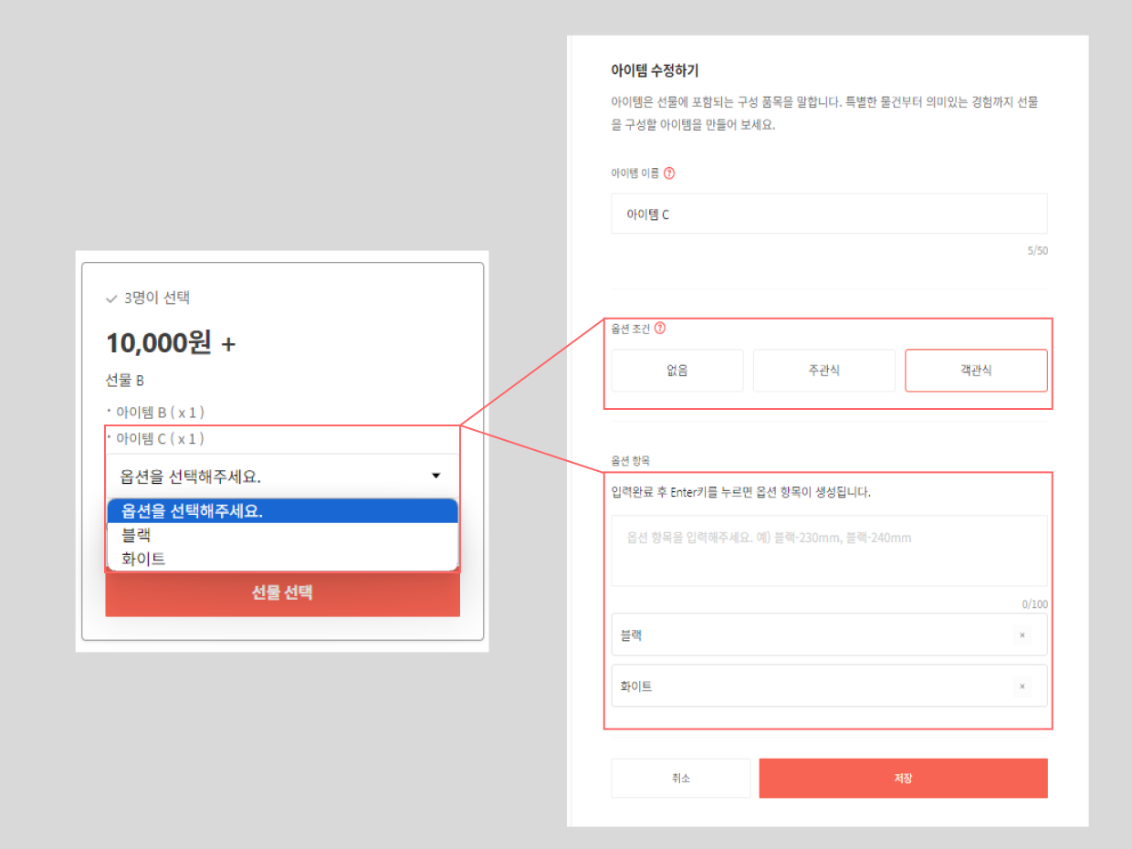 선물을 만들기 위해 '아이템'은 꼭 하나 이상 만드셔야 하고, '옵션'은 후원자의 선택이 필요한 경우에만 사용하시면 됩니다. 만드신 선물과 아이템은 후원자에게 아래 이미지처럼 보이게 됩니다.