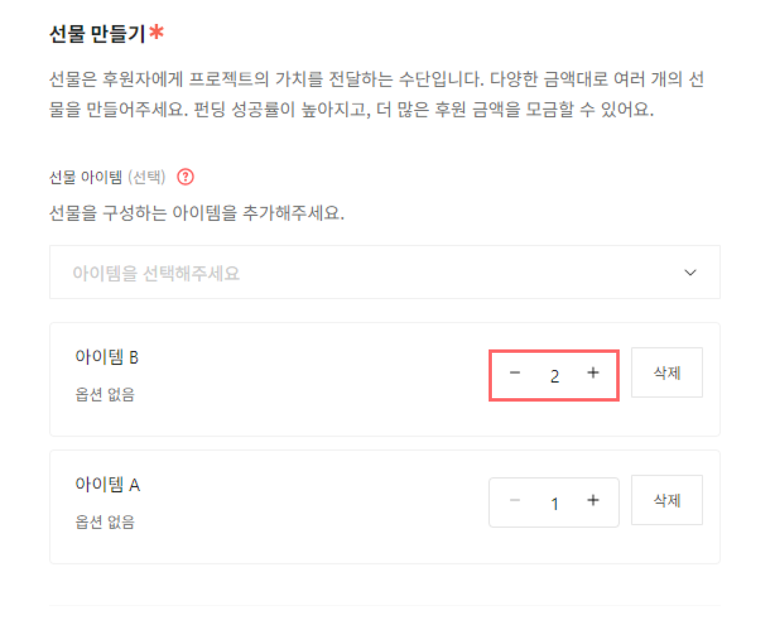 선물에 아이템 수량을 2개 이상으로 설정하면, 후원자도 후원할 때 자동으로 해당 아이템에 대한 옵션을 수량만큼 여러 번 선택하게 됩니다. 따라서 수량이 여러 개라고 해서 옵션을 복잡하게 설정하지 않아도 됩니다.