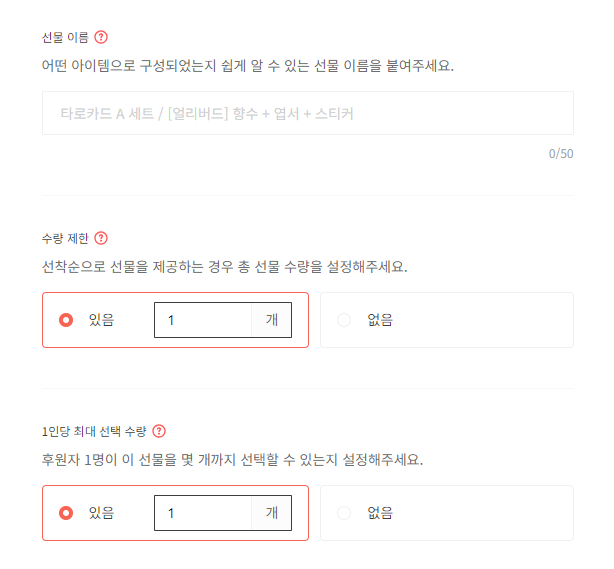 2) 수량 제한 : 선착순 수량이 제한된 선물, 얼리버드 선물의 경우 총 선물 수량을 설정해 주세요.