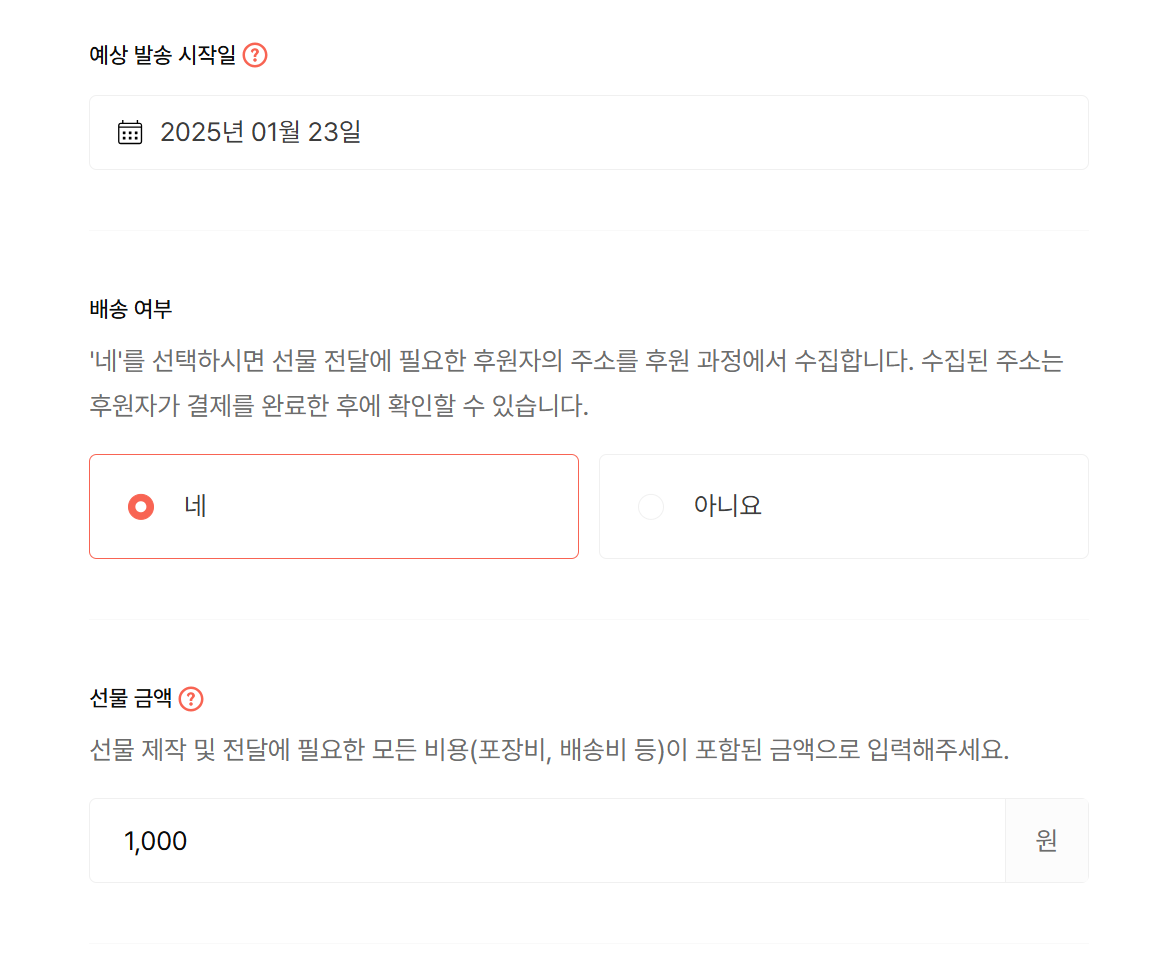 4) 예상 발송 시작일 : 선물 전달이 시작될 것으로 예상되는 일자를 설정해 주세요.