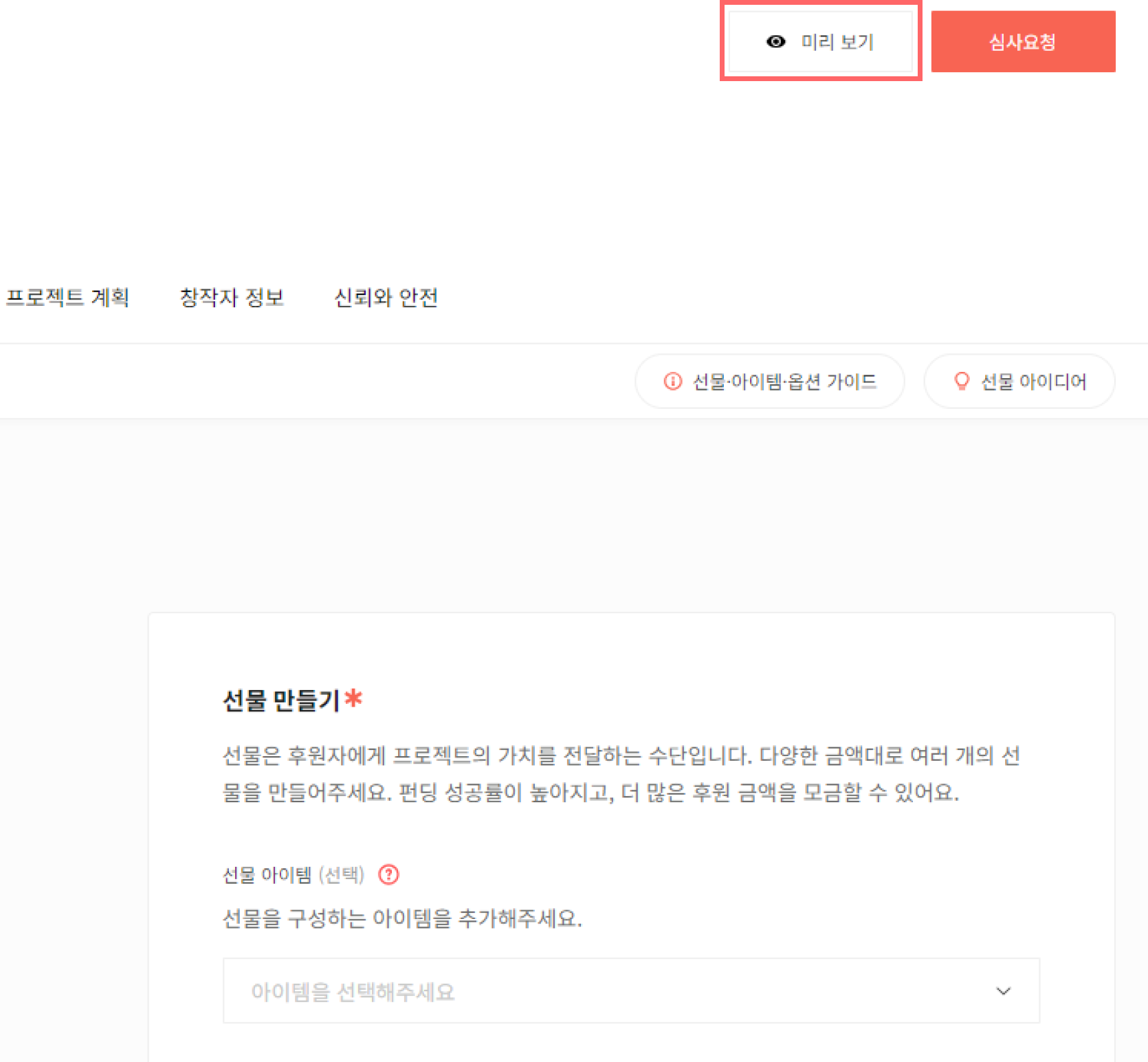 프로젝트 기획 메뉴 우측 상단 '미리 보기'를 클릭하여 만드신 선물과 아이템이 어떻게 보이는지 확인하시면 좋습니다.
