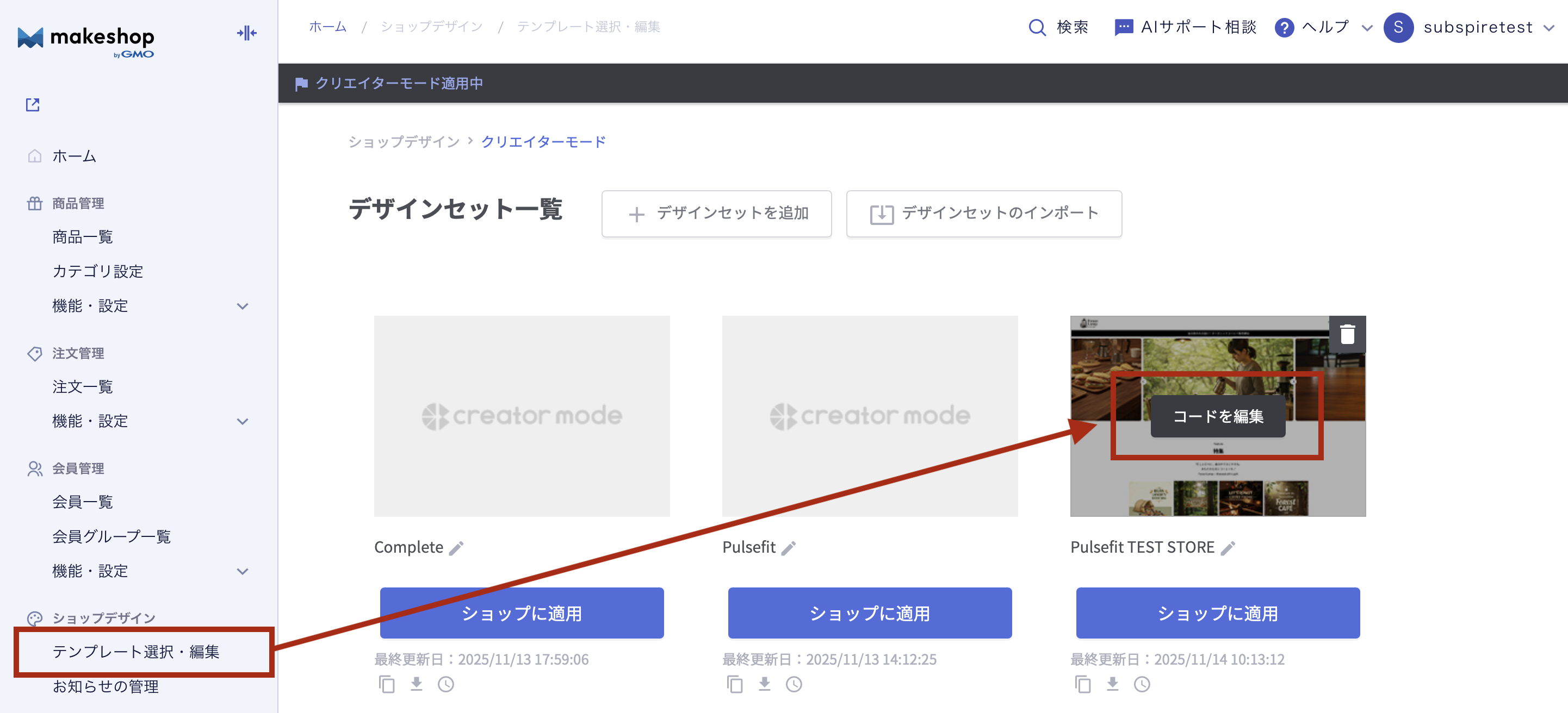 ①makeshop管理画面の「ショップデザイン > テンプレート選択・編集 > デザインセット一覧」より、使用するデザインセットを選び「コードを編集」を押します。