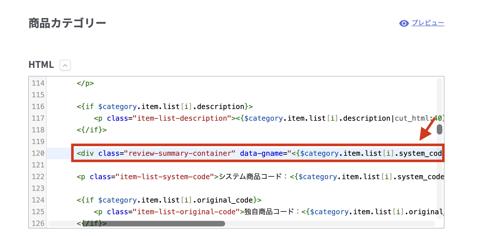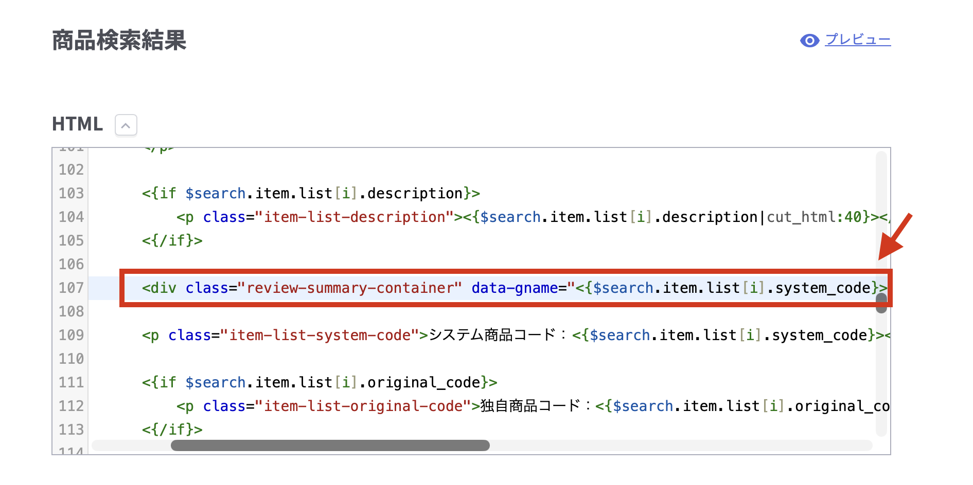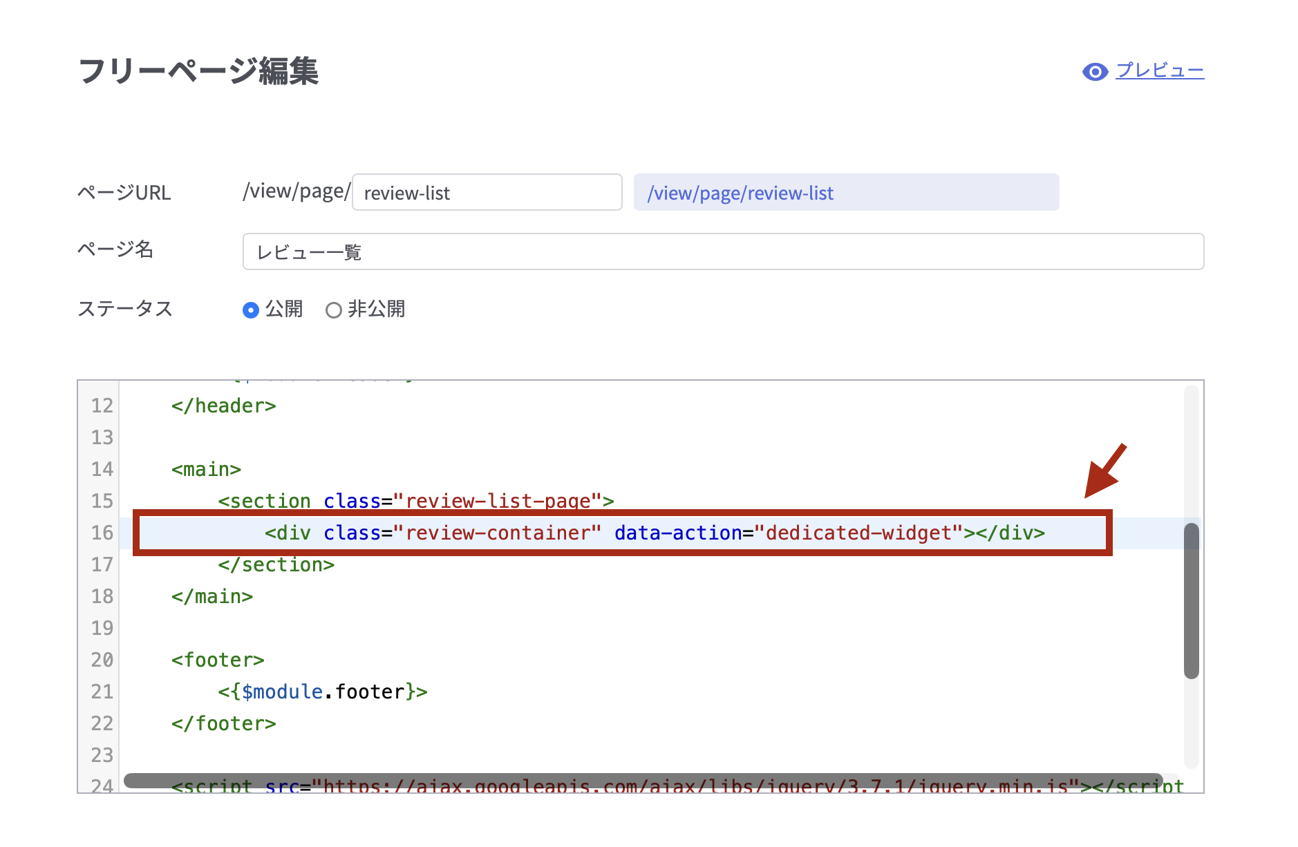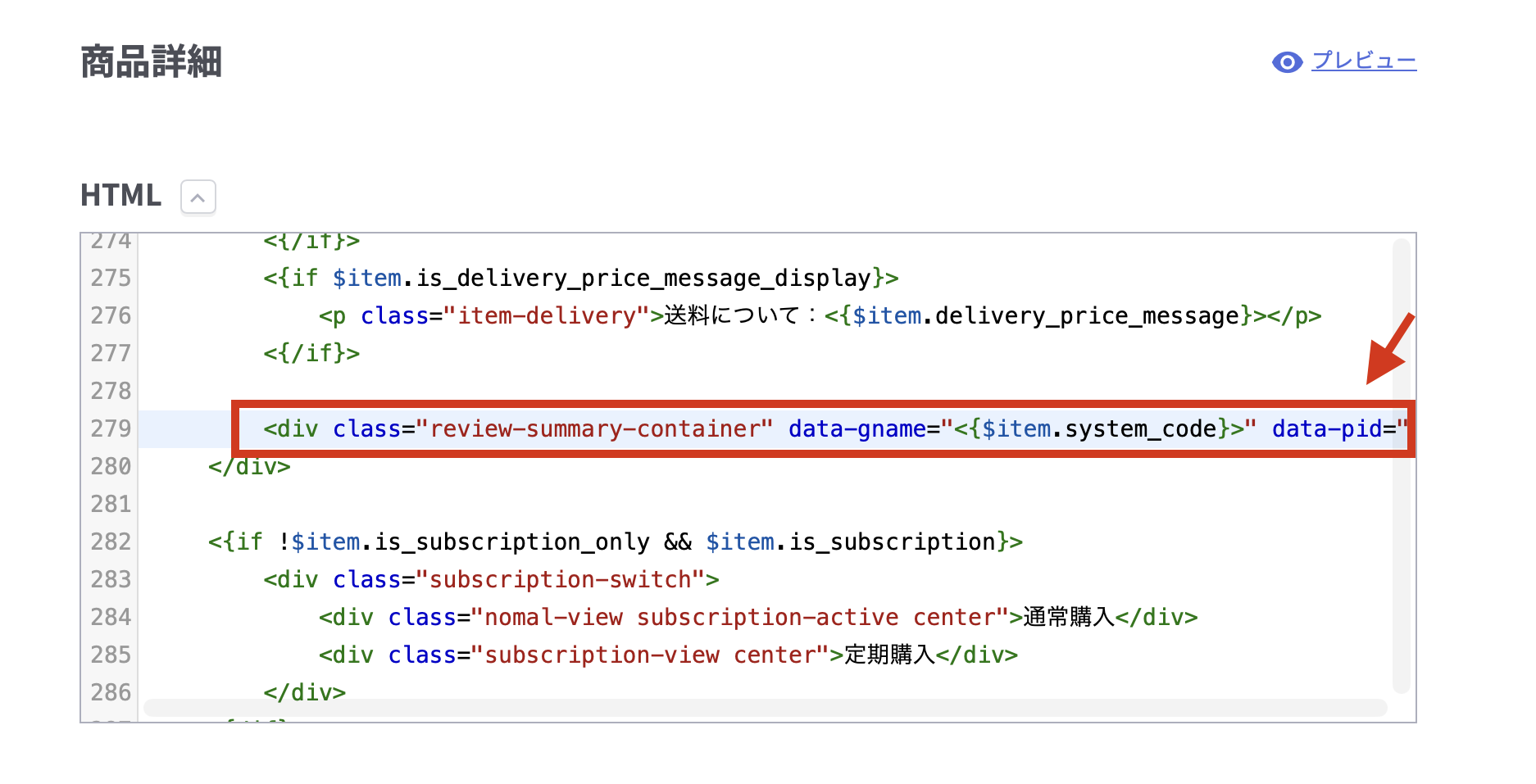 ②HTML欄にレビュー一覧を表示するタグを入力し、「保存」を押します。