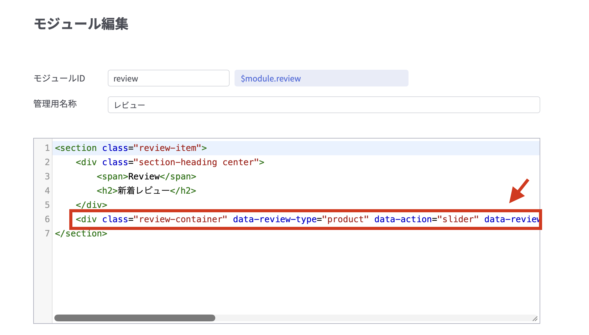 ②レビューモジュールに、スライダー形式で全表示のレビューを表示するタグを設置し、