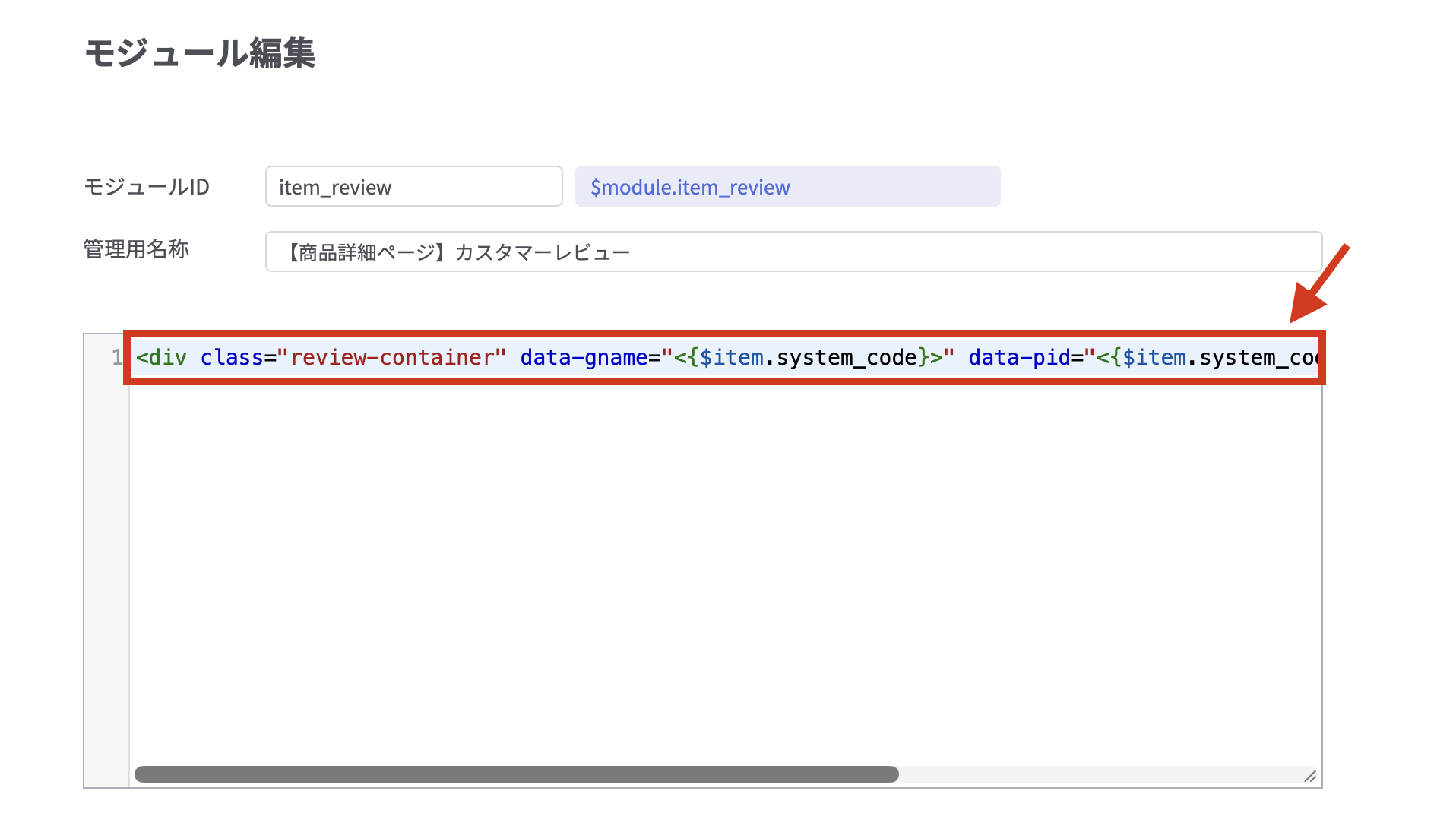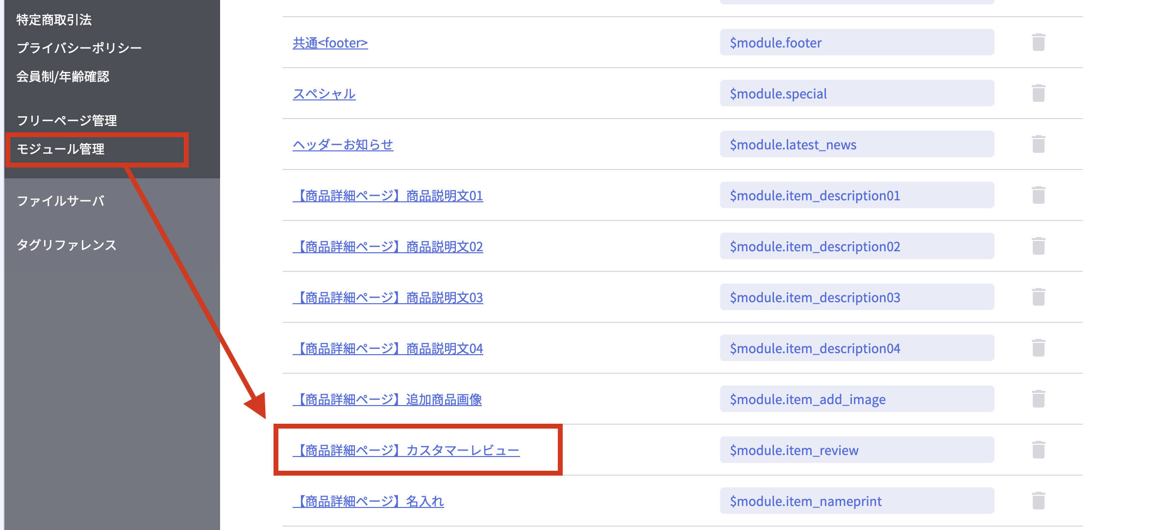 ①makeshop管理画面の「ショップデザイン > テンプレート選択・編集 > コード編集 > モジュール管理 > 【商品詳細ページ】カスタマーレビュー」を開きます。